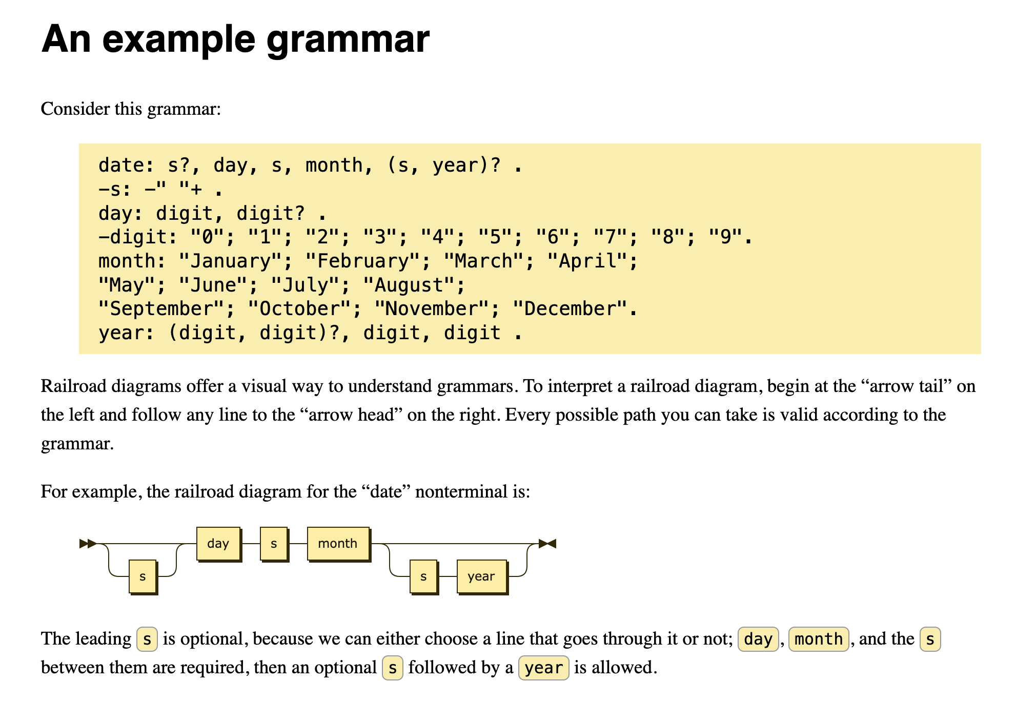 <p>For example, the railroad diagram for the “date” nonterminal is:</p>